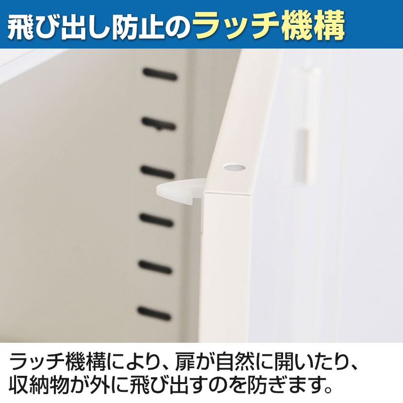 ラッチ機構により、扉が自然に開いたり、収納物が外に飛び出すのを防ぎます。