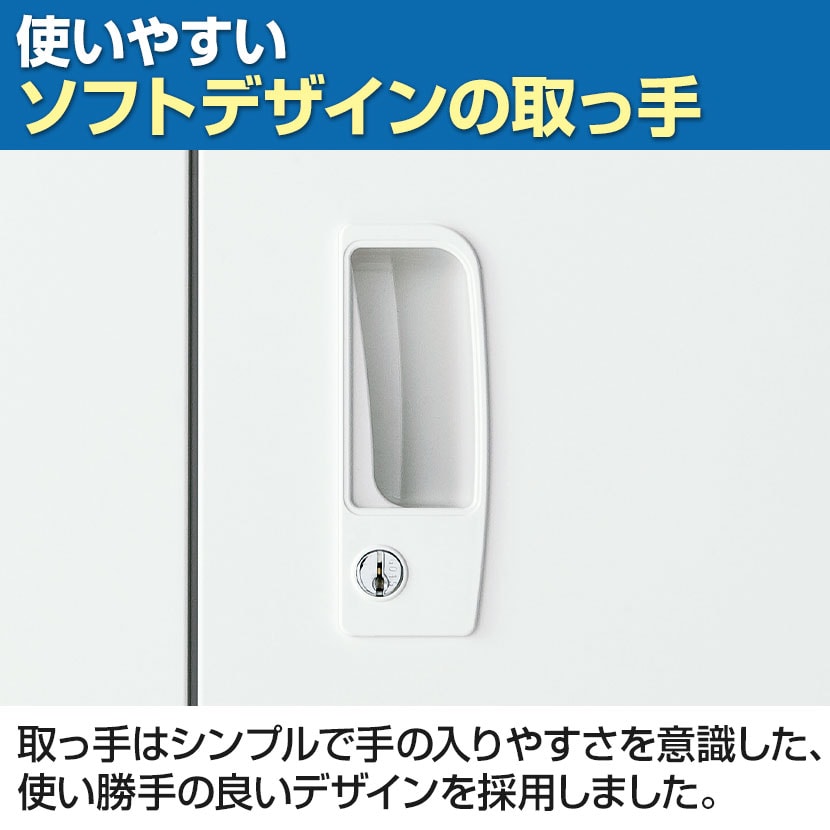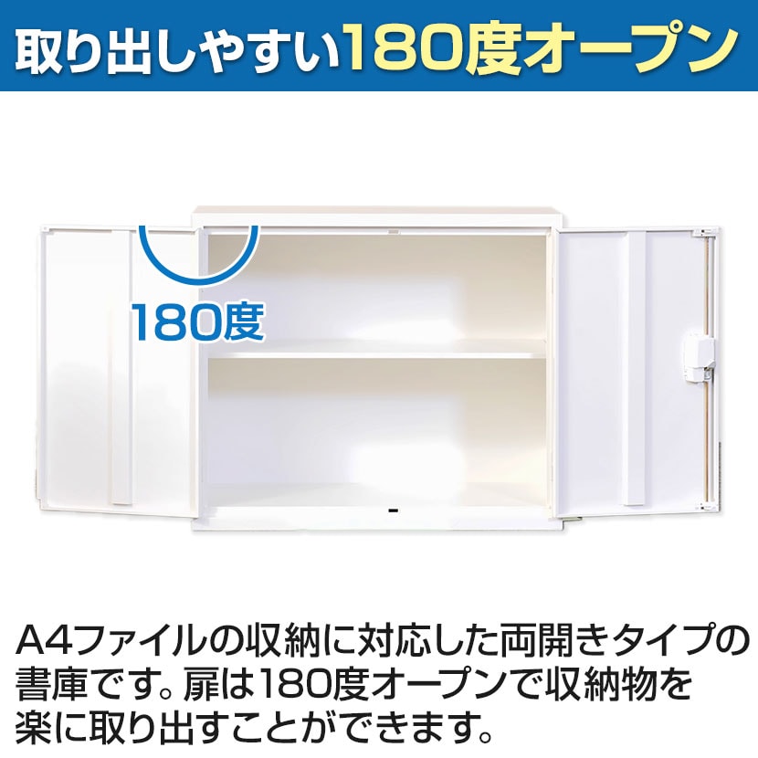 A4ファイルの収納に対応した両開きタイプの書庫です。扉は180度オープンで収納物を楽に取り出すことができます。