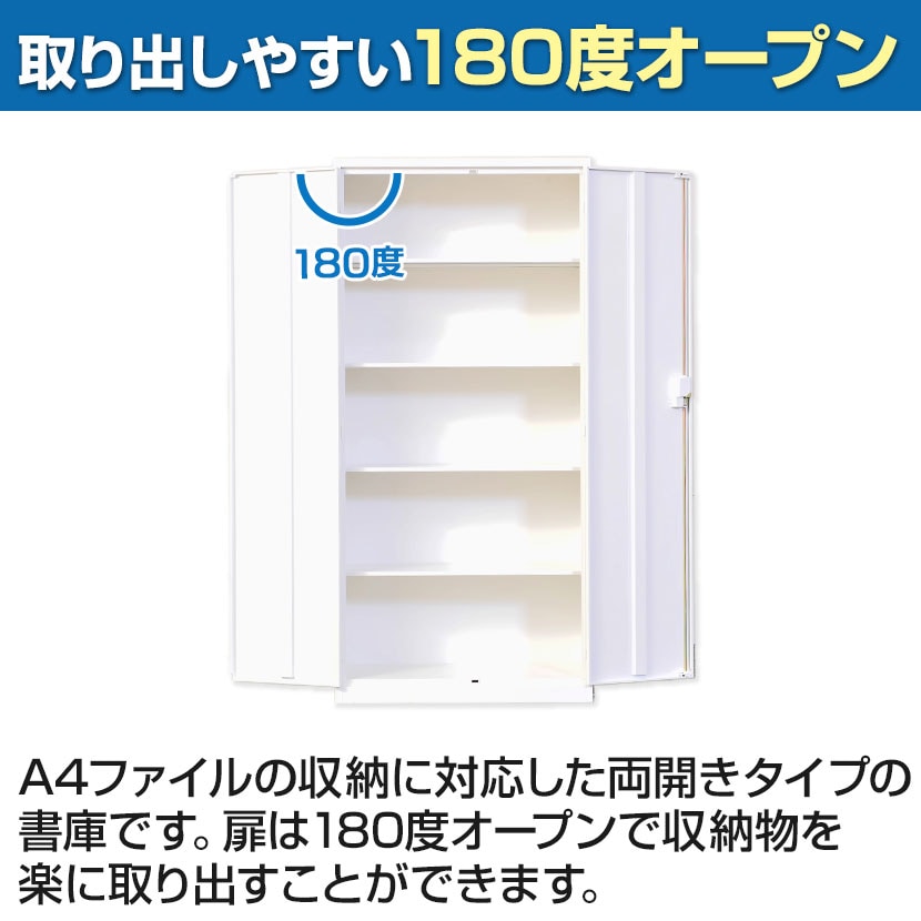 A4ファイルの収納に対応した両開きタイプの書庫です。扉は180度オープンで収納物を楽に取り出すことができます。
