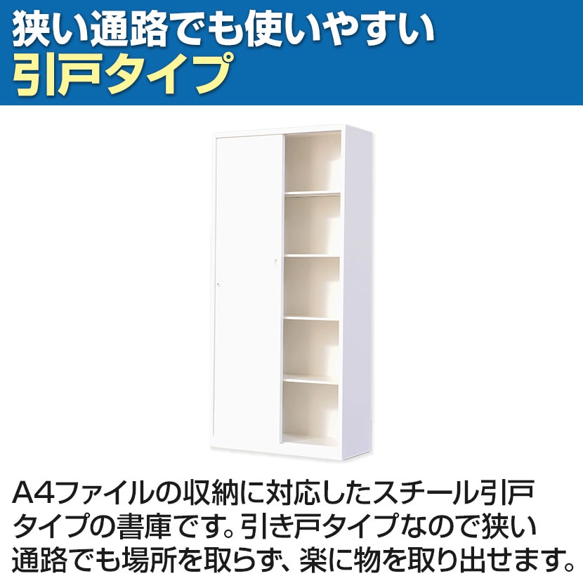 A4ファイルの収納に対応したスチール引戸タイプの書庫です。引き戸タイプなので狭い通路でも場所を取らず、楽に物を取り出せます。