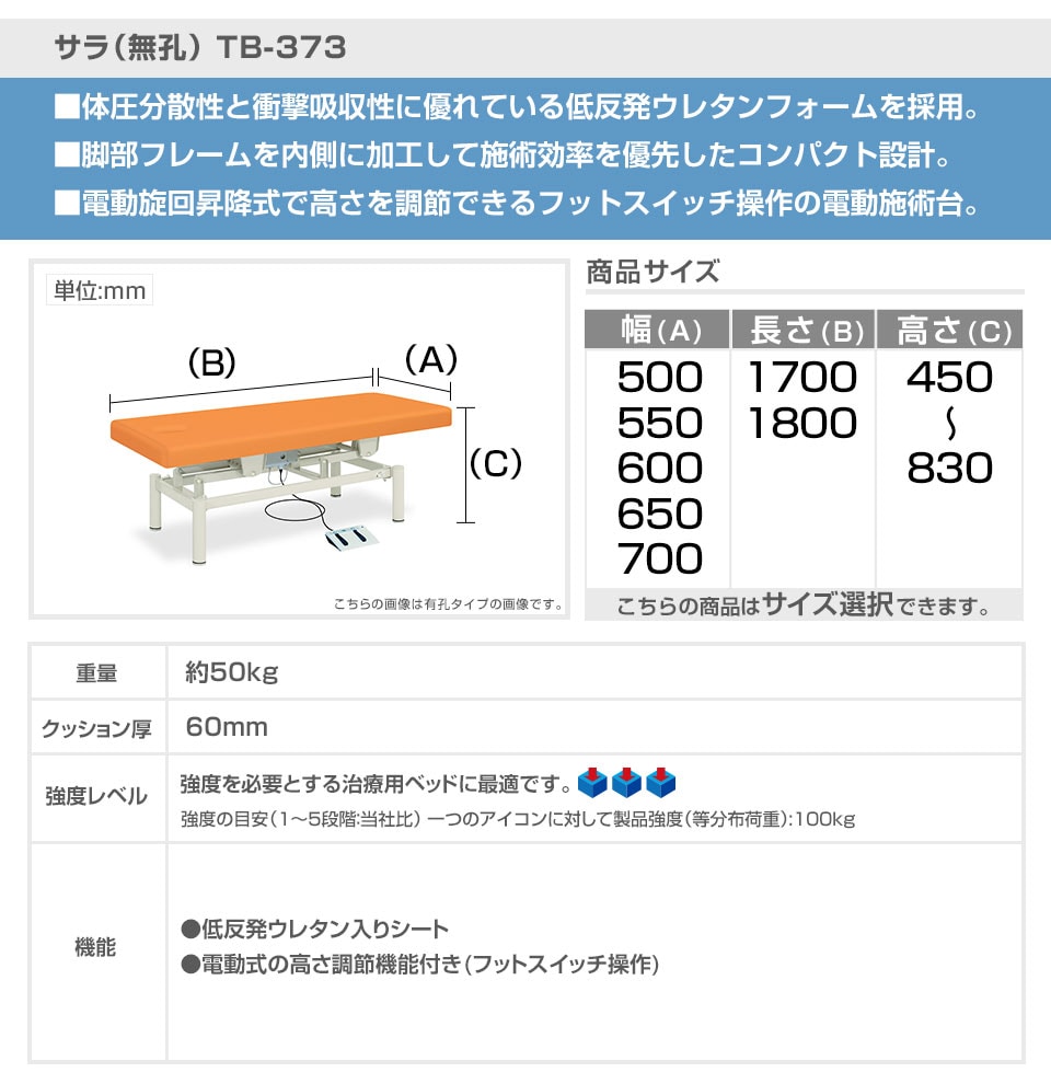 内脚構造。電動式の高さ調節機能付。フットスイッチ操作。