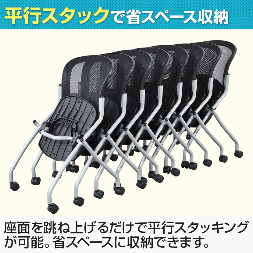 座面を跳ね上げるだけで平行スタッキングが可能。省スペースに収納できます。会議室やセミナー会場など、大量の椅子を移動・収納する際に便利な機能です。