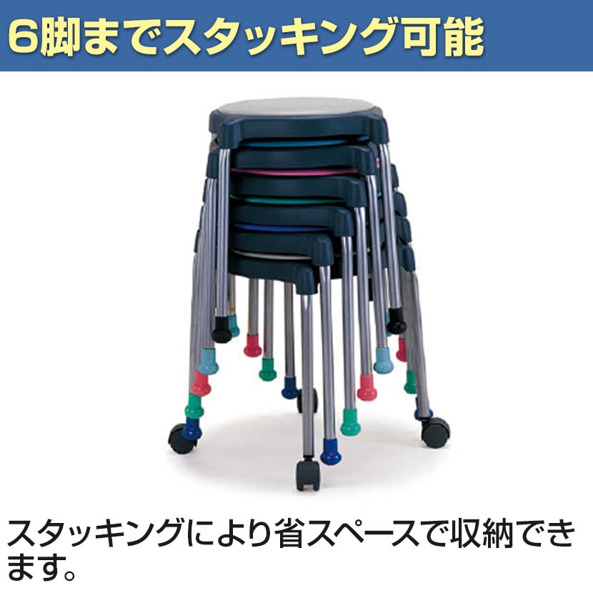 シンプルデザインのビニールレザー張り丸椅子です。脚先の滑り止めキャップ付きはシートカラーと合わせた配色で、機能性に加えてデザインのアクセントとなり、空間にポップな彩りをもたらします。収納時は6脚までスタッキングでき、省スペースに収まります。
