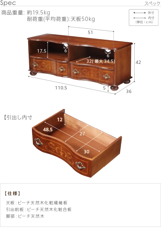 引出し内寸 / 幅485×奥行270(最大300)×高さ120mm