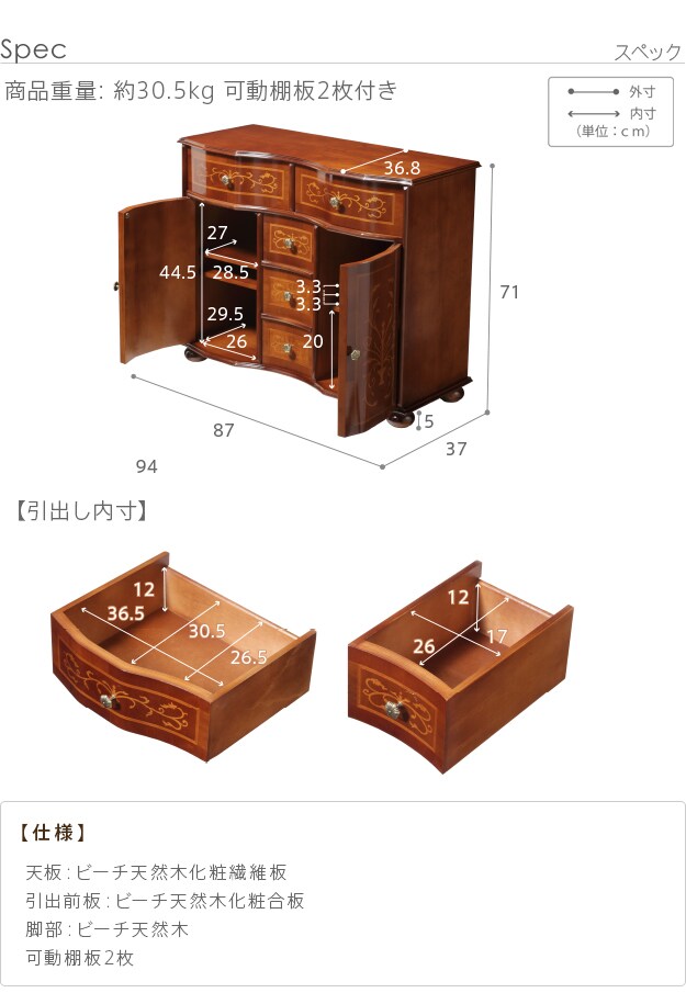 引出し内寸(大) / 幅365×奥行265(最大305)×高さ120mm