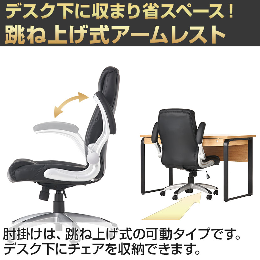 シーンに応じて切り替えられる跳ね上げ式可動タイプの肘掛けです。デスク下にコンパクトにチェアを収納できます。