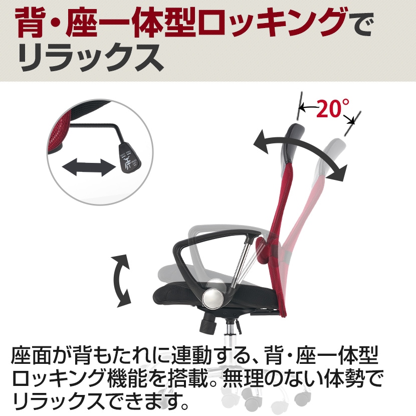 座面が背もたれに連動する、背・座一体型ロッキング機能を搭載。無理のない体勢でリラックスできます。