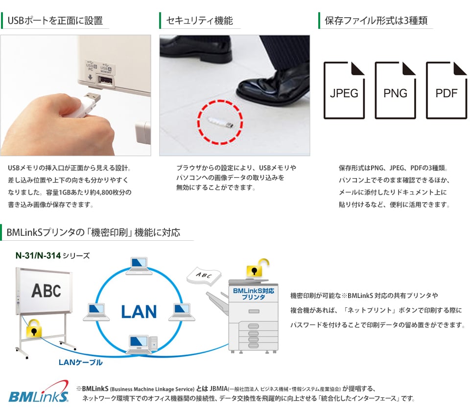 ※USBメモリは付属しておりません。ファイルフォーマット FAT12、16、32に対応しています。また、差し込んだUSBメモリのデータをボード板面へ表示したり、ボード本体と接続しているプリンタへの出力はできません。