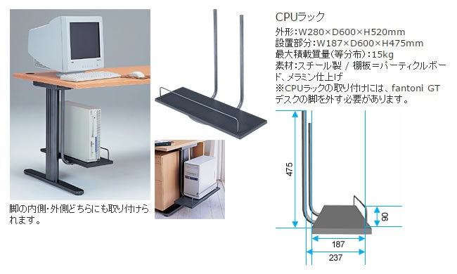 fantoniGTのT字脚部に取り付けるPCラックです。取付位置は脚の内側、外側が選べます。取り付けには、デスクの脚を一旦外す必要があります。設置部分有効寸法:W187×D600×H475mm※Mac G5を置くには高さが少し足りません