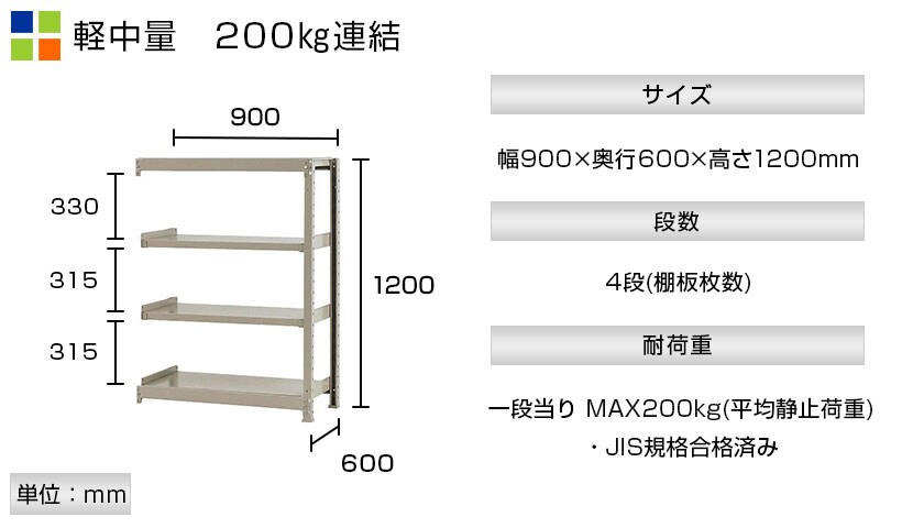 - スチールラック 軽中量棚 200kg/段