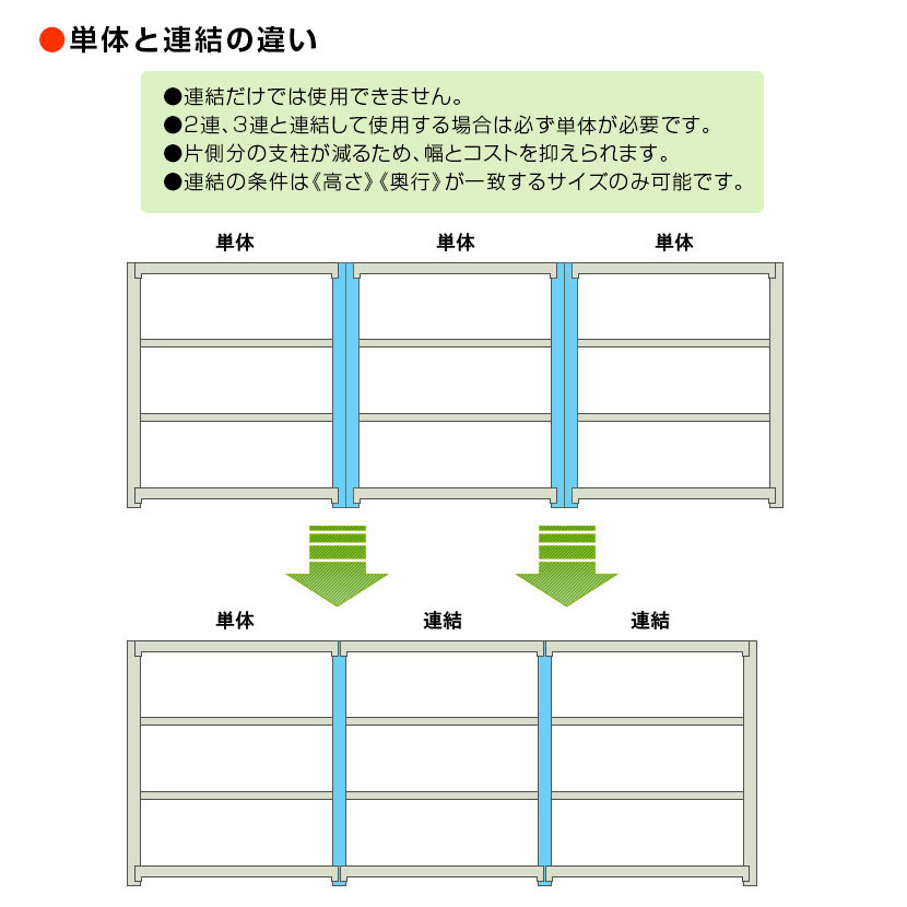 ※連結(増設用)は片側の支柱が無い為、必ず単体と組み合わせて使用して下さい。