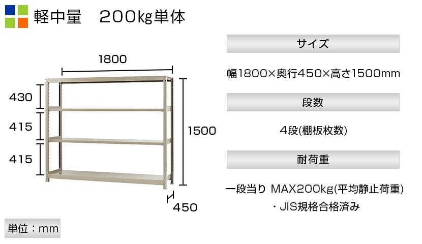 - スチールラック 軽中量棚 200kg/段