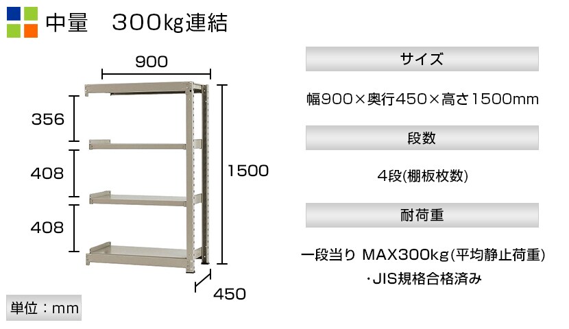 国産スチールラック 中量棚300kg/段 天地4段...82,500円(税込)75,000円(税抜) -