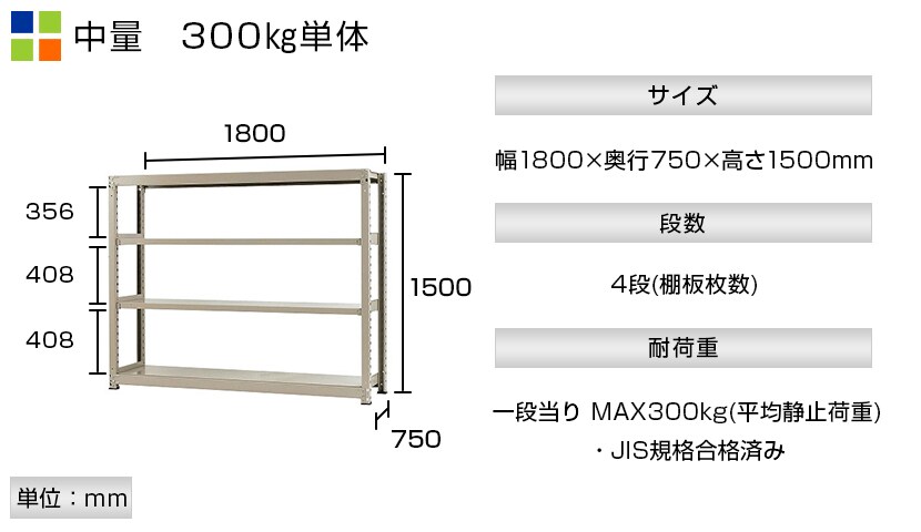 - スチールラック 中量棚 300kg/段