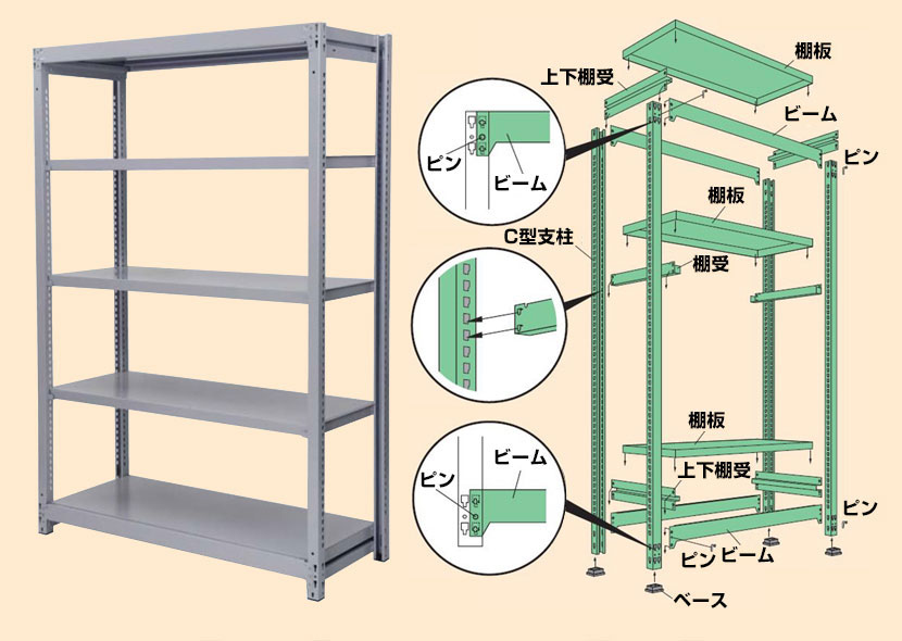 ボルトレスの為、段変更、組立、解体が簡単です。