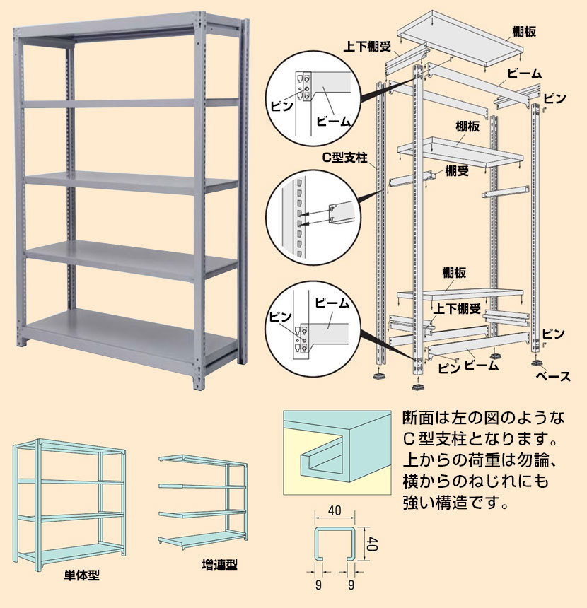 ボルトレスの為、段変更、組立、解体が簡単です。