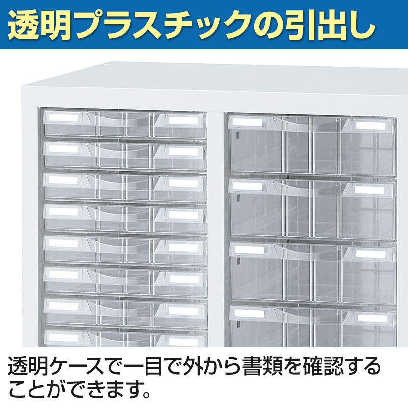一目で中の収納物が確認できる透明書類ケース2列と3段オープン棚が一緒になったスチール書庫です。書類ケースにはA4サイズの書類を収納でき、オープン棚にはファイルを収納できるのできれいに整理整頓ができます。塗装には、耐久性に優れ、環境を汚さない粉体塗装を使用しています。