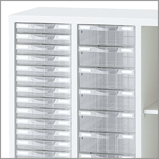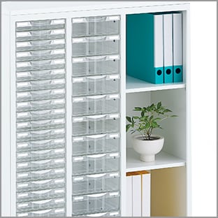 浅型24段、深型12段の透明プラスチックケースと3段のオープン棚が一つになったスチール書庫です。