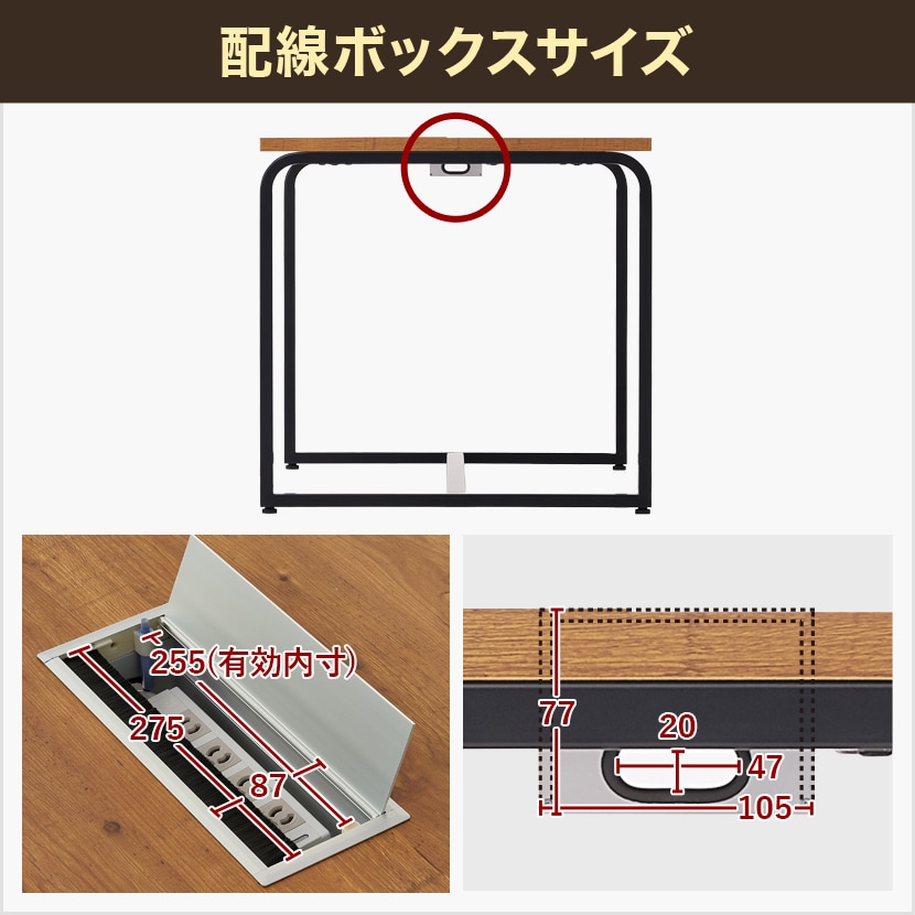 天板にはケーブルタップを収納できる、スッキリとしたデザインのアルミニウム製配線ボックスが付いています。