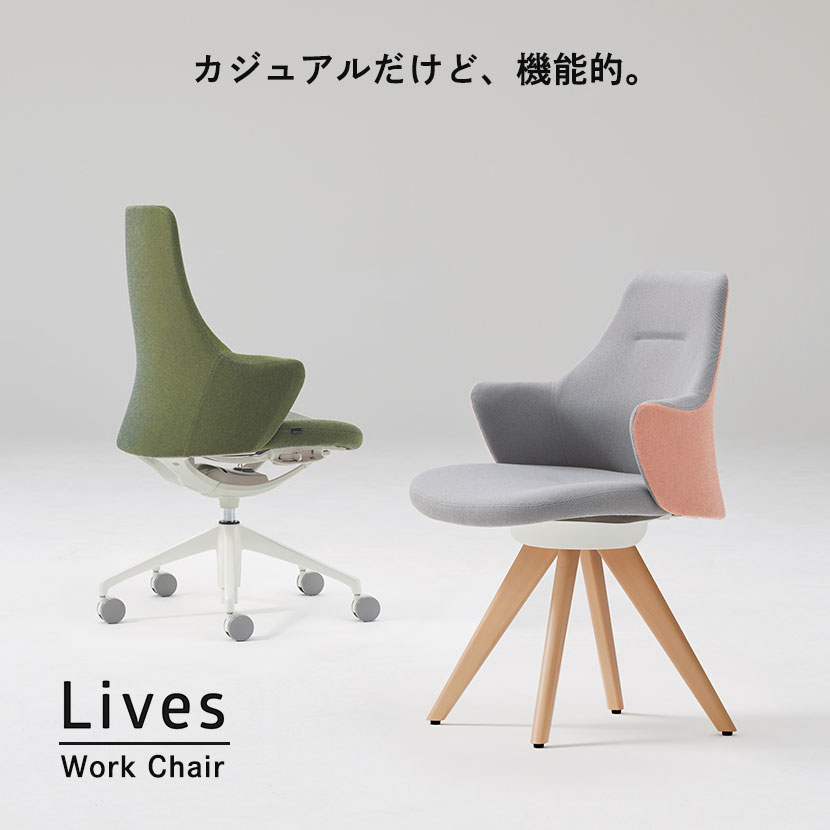 まるでカフェのようにリラックスできる居心地の良さと、集中して働くための機能を備えたLivesシリーズのワークチェア。オフィスシーティングに必要不可欠な機能を搭載しているので、体格に合わせて座面の高さを調節したり、からだに負担をかけることなく快適にリクライニングできます。