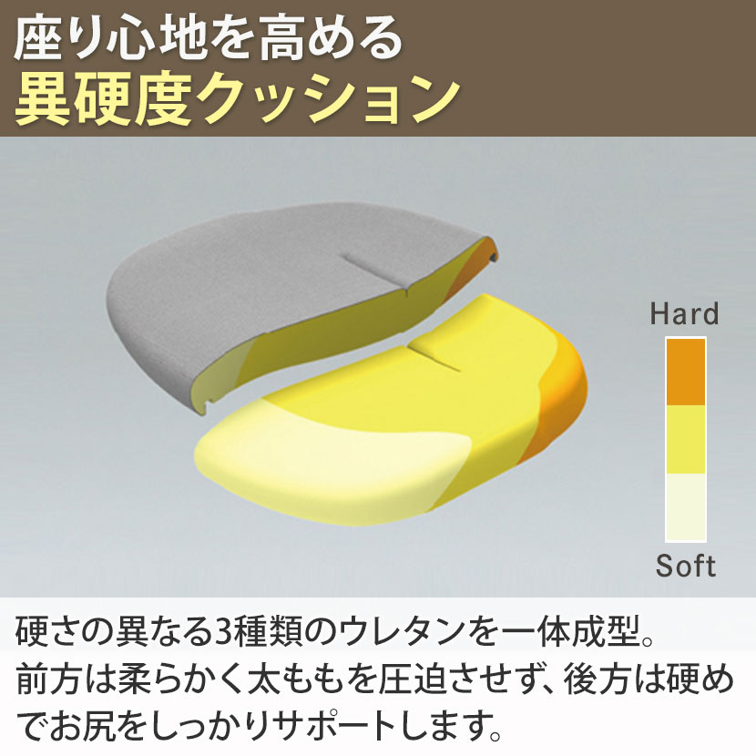 座面前方は太ももを圧迫しないように柔らかく、後方はお尻をしっかりサポートする硬めのクッションを採用。