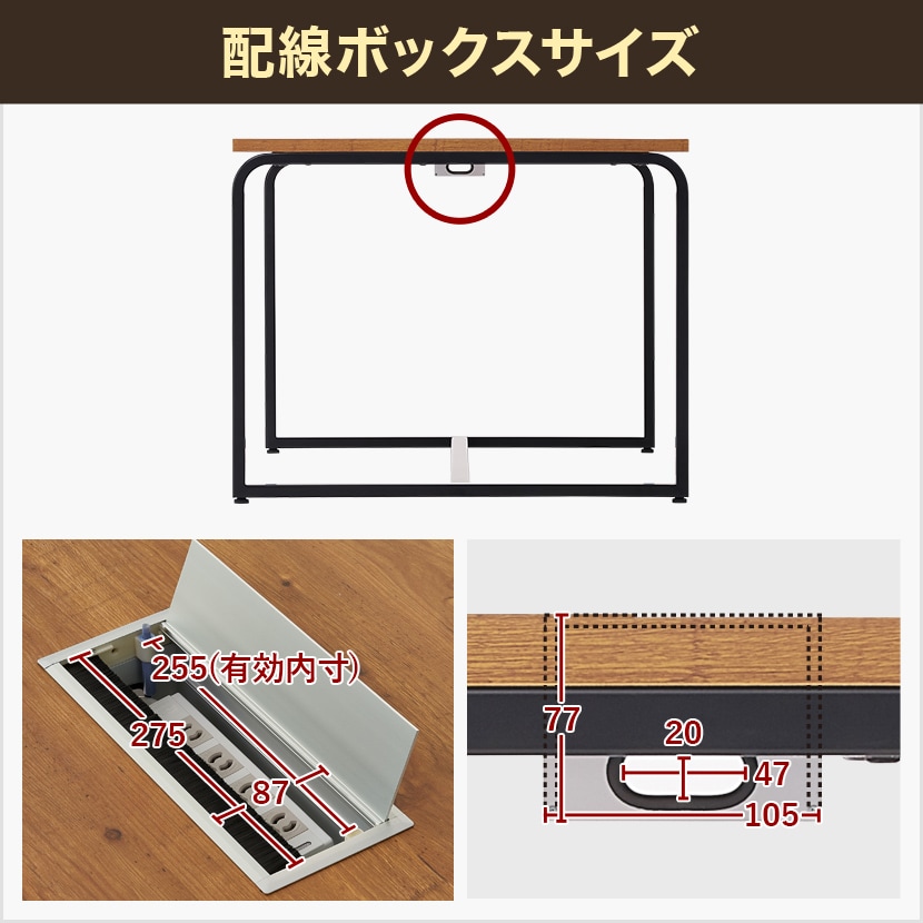 天板にはケーブルタップを収納できる、スッキリとしたデザインのアルミニウム製配線ボックスが付いています。
