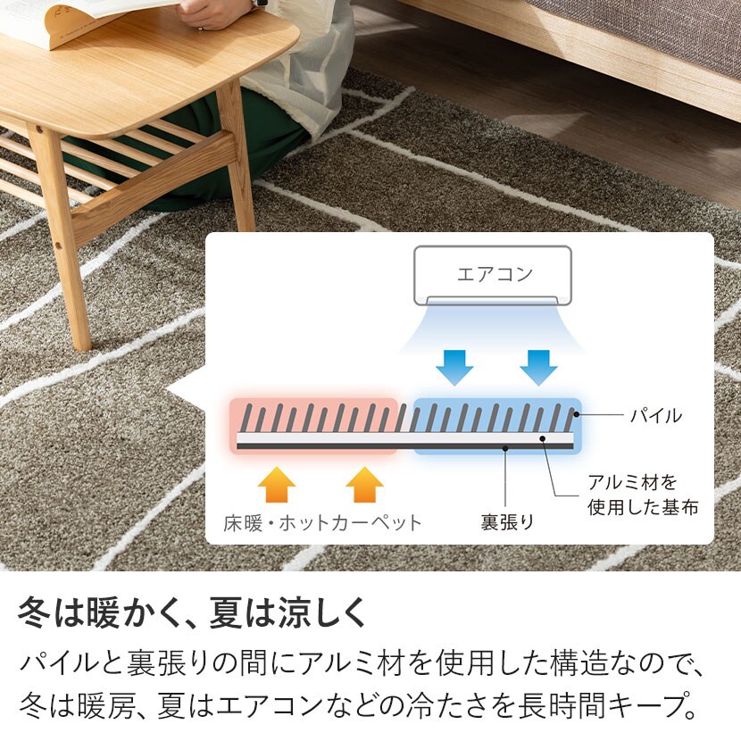●パイルと裏張りの間にアルミ材を使用した構造なので、冬は床暖房やホットカーペットの熱源で暖かさが長持ち、夏はエアコンの冷たさを長時間保持します。