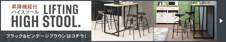 スタンディングデスクやカウンターテーブルなど、高さのある机とのあわせ使いにぴったりなハイスツール。コンパクトなので移動がしやすく、座りたい場所で手軽に使える一脚です。脚はすっきりとしたスマートなデザインで、昇降機能や足置きなど機能面にもこだわりました。座面は座り心地のよいクッション仕様。味わい深いシボ感のあるビンテージ風カラーです。