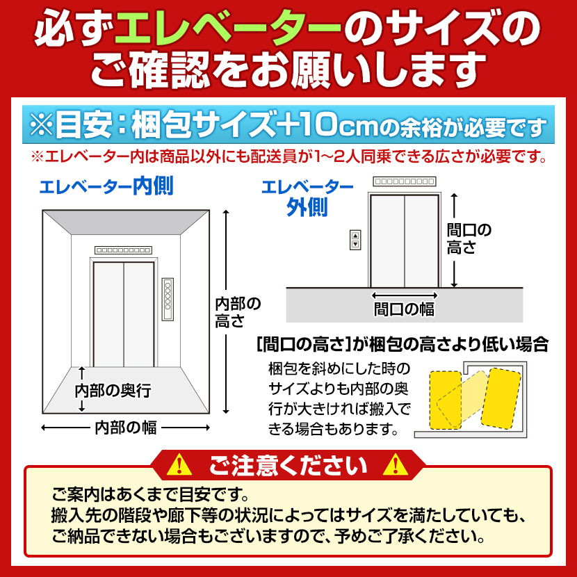 あらかじめ商品のサイズと搬入経路の幅をご確認ください。搬入条件については「搬送について」の画像をご確認ください。