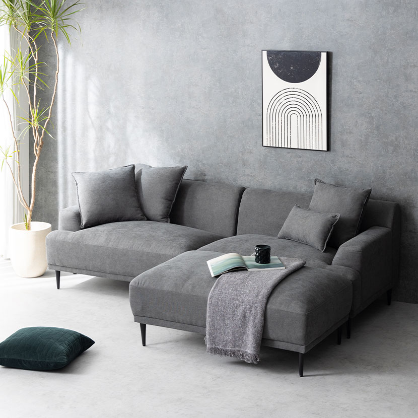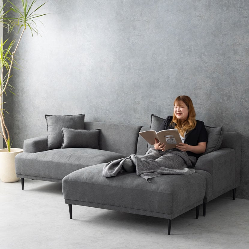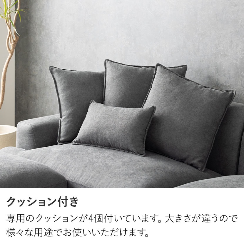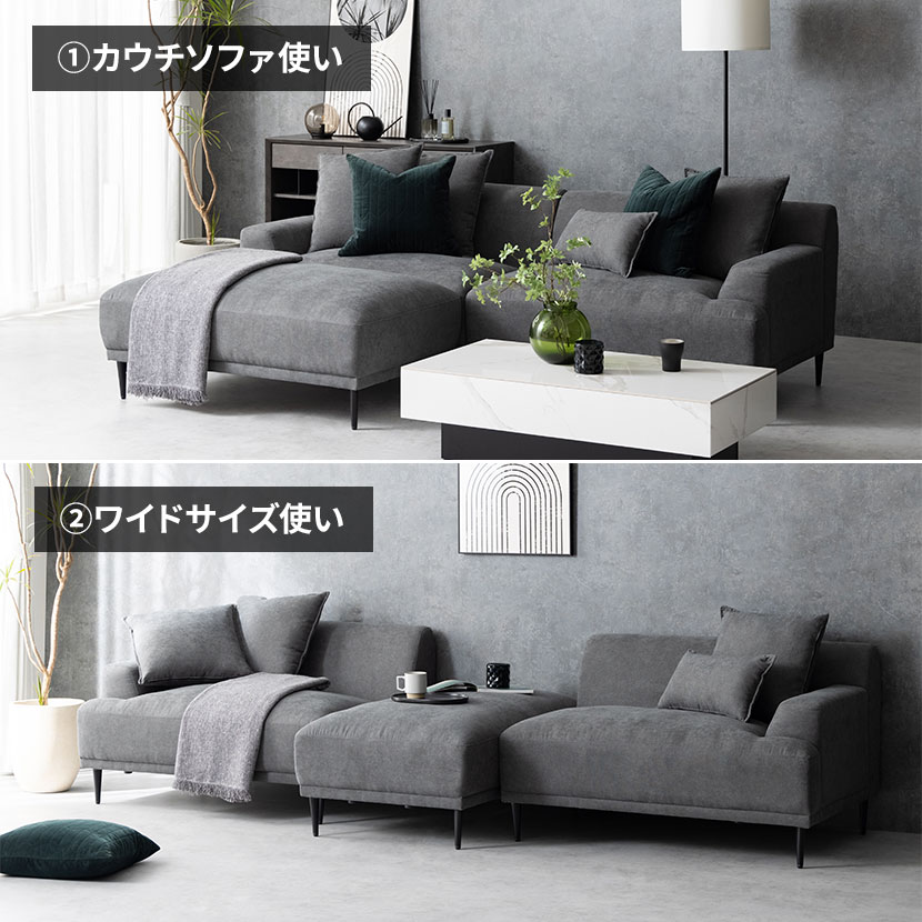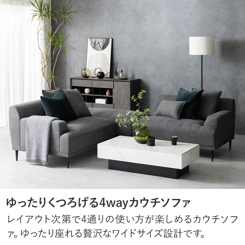 レイアウト次第で4通りの使い方が楽しめるカウチソファ。ゆったり座れる贅沢なワイドサイズ設計です。