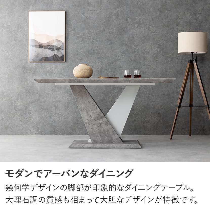 幾何学デザインの脚部が印象的なダイニングテーブル。大理石調の質感も相まって大胆なデザインが特徴です。