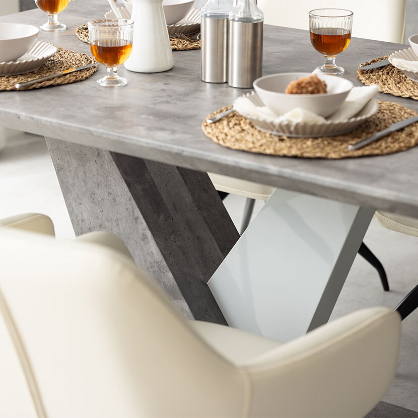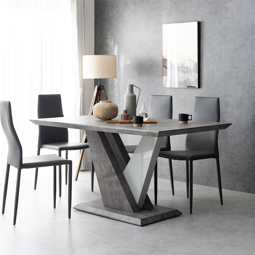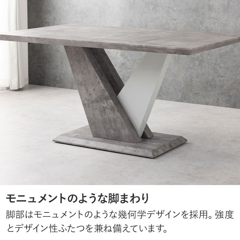 幾何学デザインの脚部が印象的なダイニングテーブル。大理石調の質感も相まって大胆なデザインが特徴です。