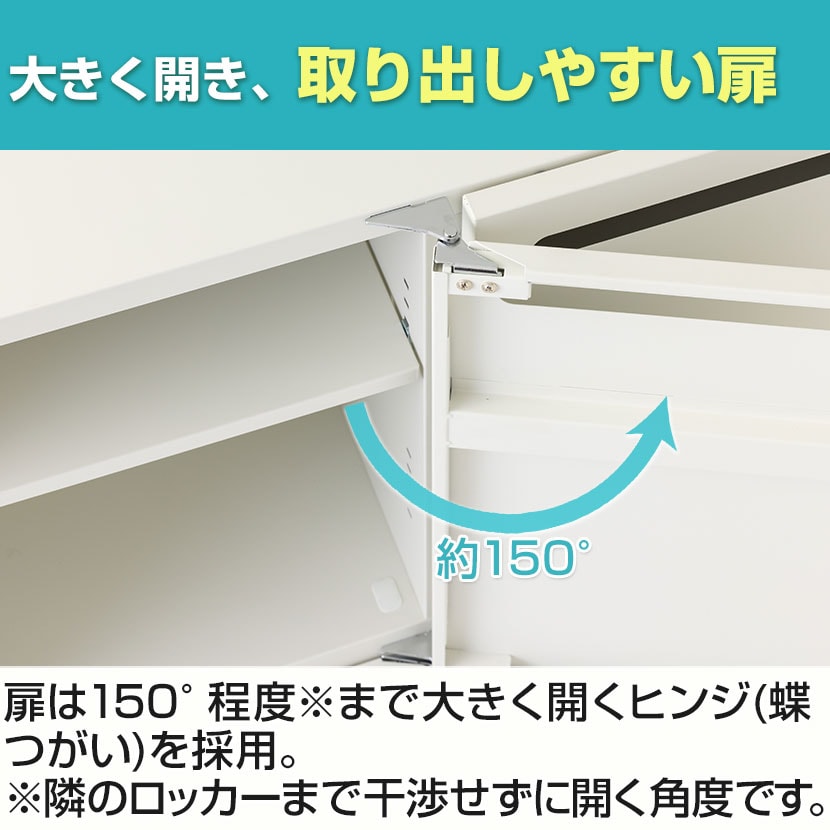 扉は150°程度※まで大きく開くヒンジ(蝶つがい)を採用。※隣のロッカーまで干渉せずに開く角度です。