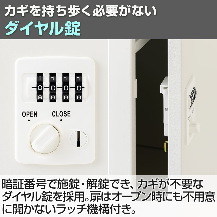 暗証番号で施錠・解錠でき、カギが不要なダイヤル錠を採用。しっかりと中身を守ります。扉はオープン時にも不用意に開かないラッチ機構付き。