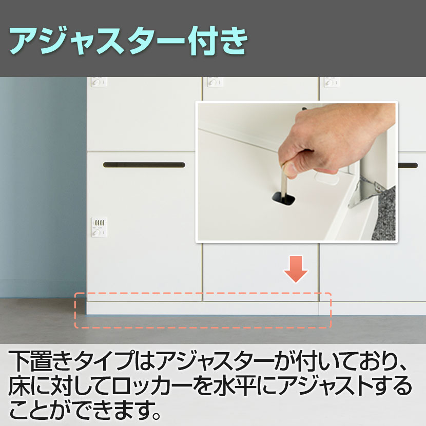 下置きタイプはアジャスターが付いており、床に対してロッカーを水平にアジャストすることができます。