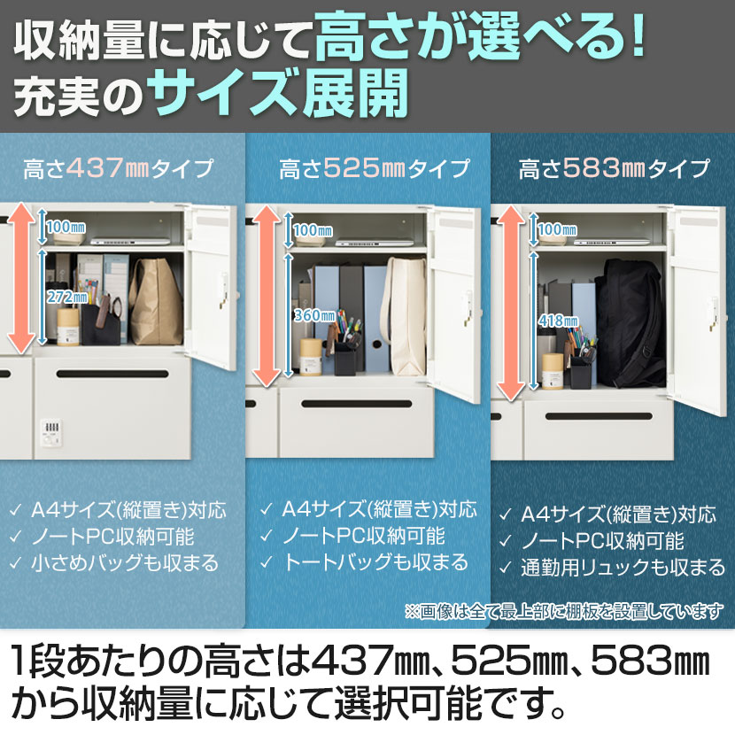 GSパーソナルロッカーには、Great Strage(大きな収納量)やGood Size(ちょうどいいサイズ)といった意味が込められています。その名の通り、1人あたり幅450×奥行450mmのゆとりあるサイズで、高さは437mm、525mm、583mmから収納量に応じて選択可能です。カバン類やA4ファイルボックスにも対応し、庫内の可動式の棚板を調節すれば、使用頻度に合わせてノートPCや書類を効率的に収納できます。