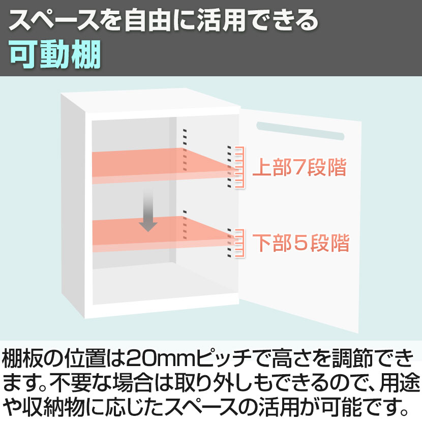 棚板の位置は20mmピッチで高さを調節できます。不要な場合は取り外しもできるので、用途や収納物に応じたスペースの活用が可能です。