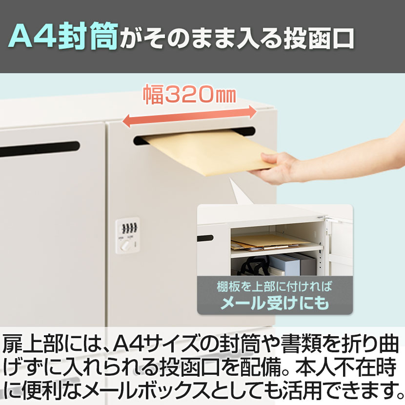 扉上部には、A4サイズの封筒や書類を折り曲げずに入れられる投函口を配備。本人不在時に便利なメールボックスとしても活用できます。