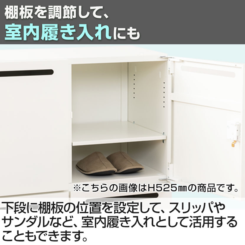 下段に棚板の位置を設定して、スリッパやサンダルなど、室内履き入れとして活用することもできます。
