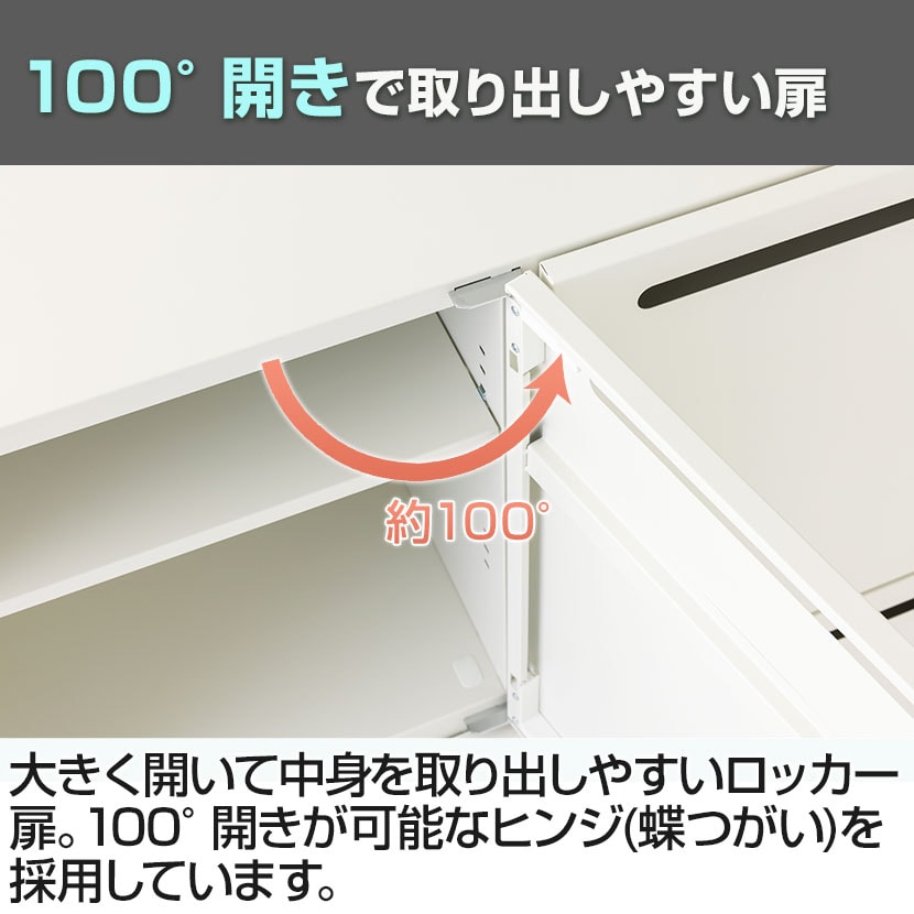 大きく開いて、中身を取り出しやすいロッカー扉。100°開きが可能なヒンジ(蝶つがい)を採用しています。