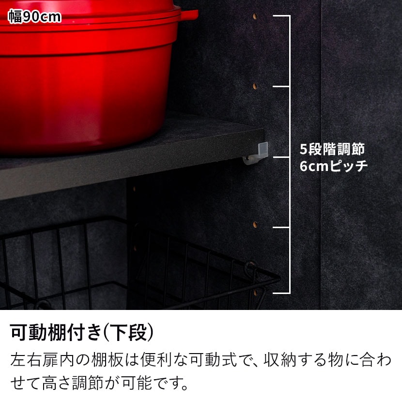 物の出し入れがしやすいオープン収納、中を隠すことができる扉付き収納、便利な可動棚など、収納する物に合わせてお使いいただけます。