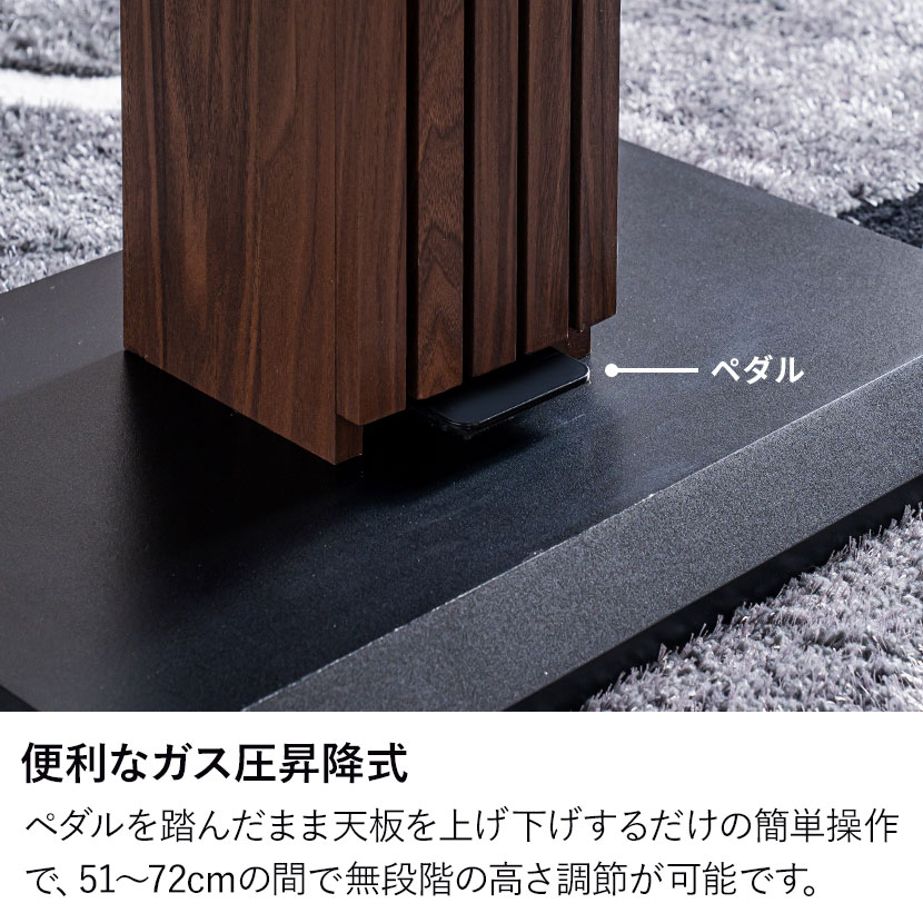 支柱下部のペダルを踏んだまま天板を上げ下げするだけの簡単操作で、51~72cmの間で無段階の高さ調節が可能です。
