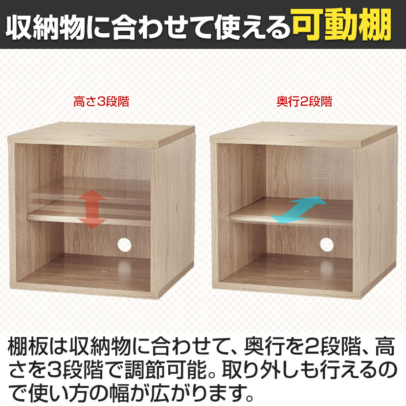取り外しができる棚板付き。奥行2段階、高さ3段階調節可能。
