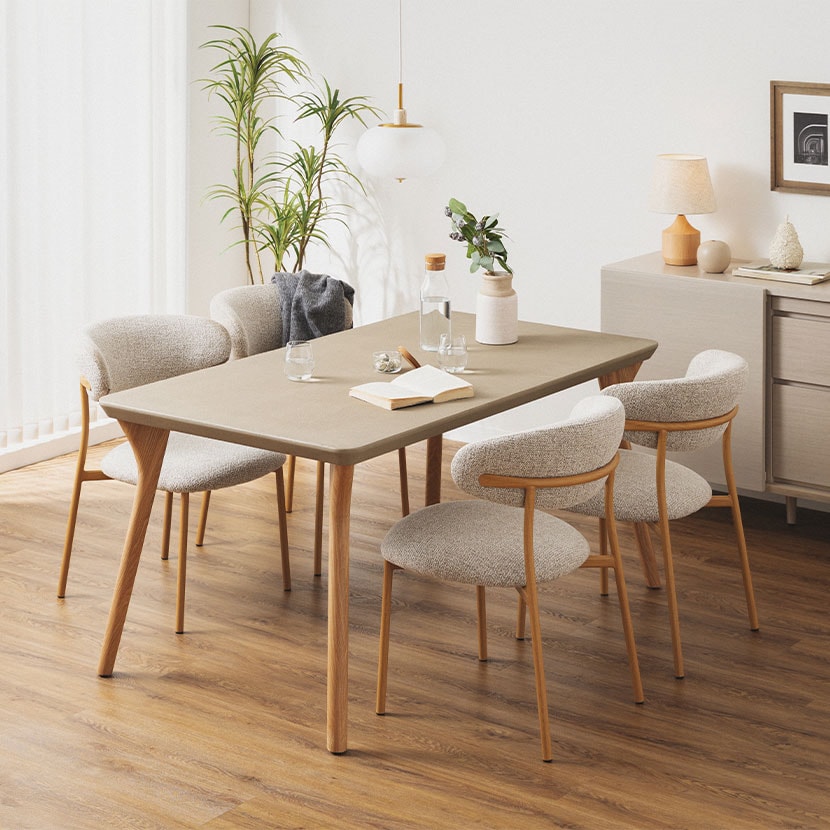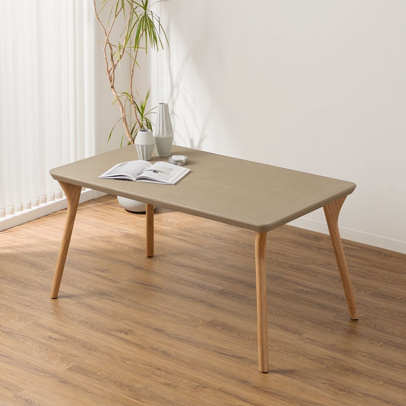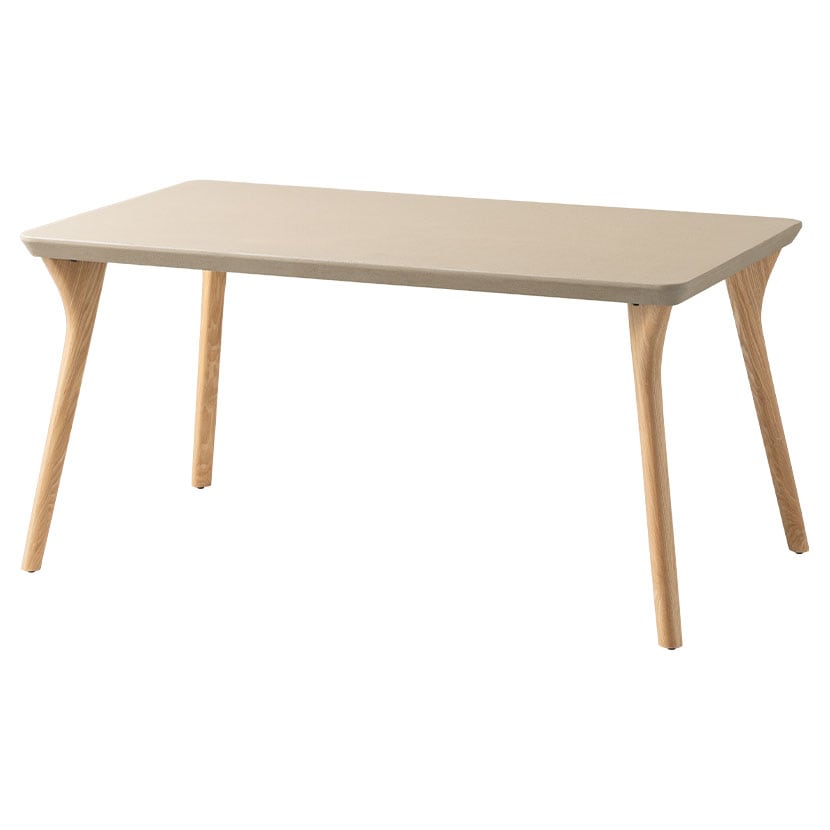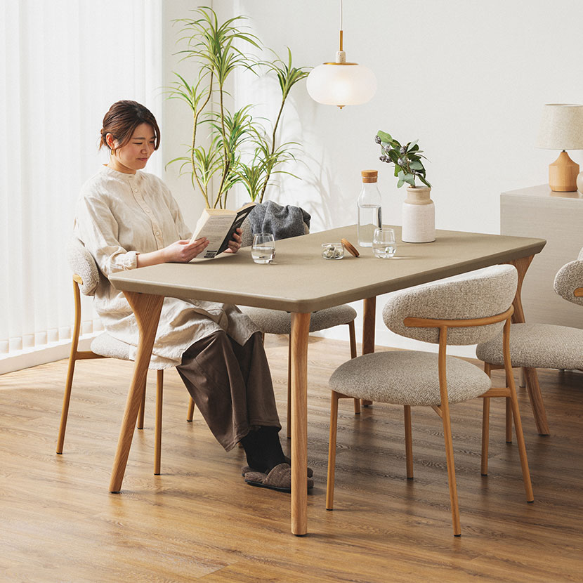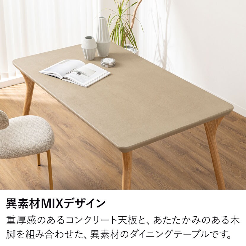 重厚感のあるコンクリート天板と、あたたかみのある木脚を組み合わせた、異素材のダイニングテーブルです。