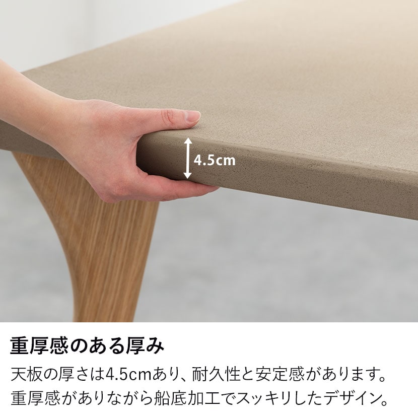 天板の厚さは4.5cmあり、耐久性と安定感があります。重厚感がありながら船底加工でスッキリしたデザイン。