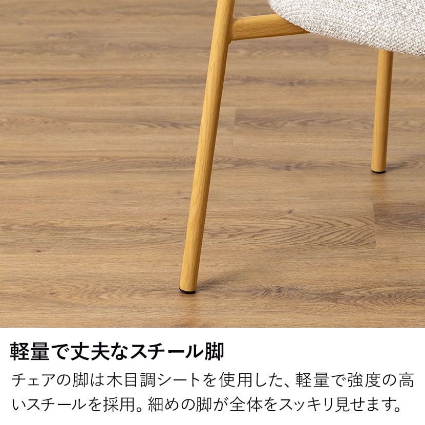 チェアの脚は木目調シートを使用した、軽量で強度の高いスチールを採用。細めの脚が全体をスッキリ見せます。