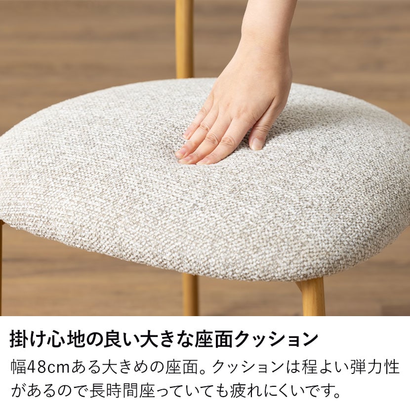 幅48cmある大きめの座面。クッションは程よい弾力性があるので長時間座っていても疲れにくいです。