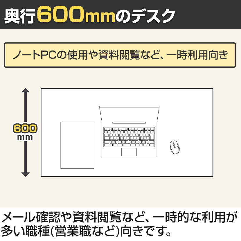 フロアレイアウトに適した奥行き600mmでフリーアドレスからパーソナルデスクにまで幅広くご利用いただけます。