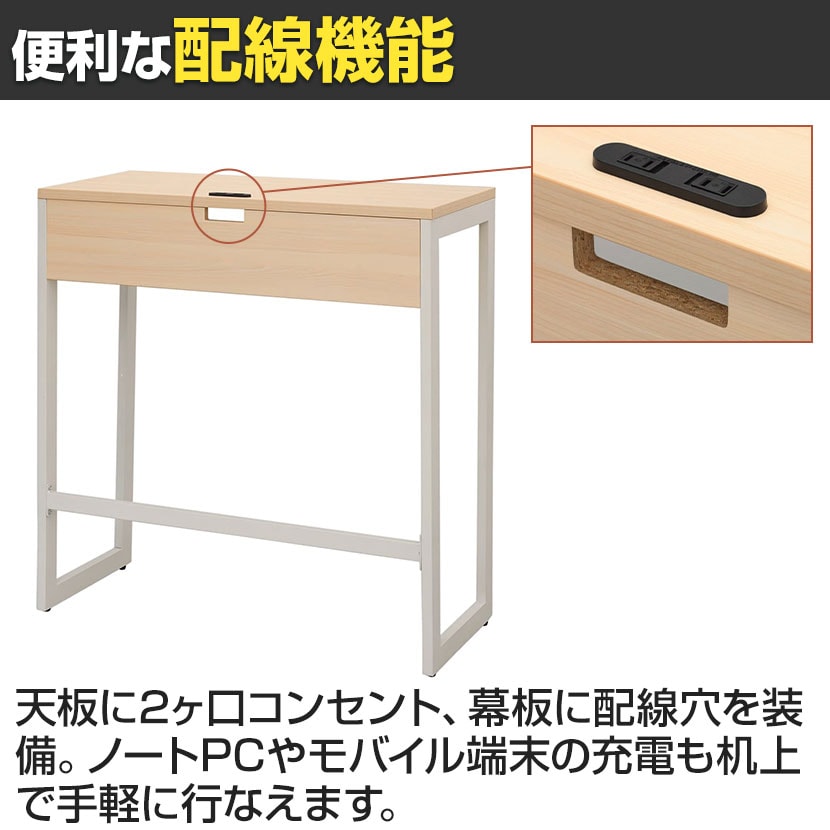 幕板に配線穴、天板には中央1箇所に2ヶ口コンセントを備えています。