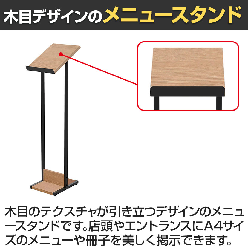 ・木目のテクスチャが引き立つメニュースタンド。
